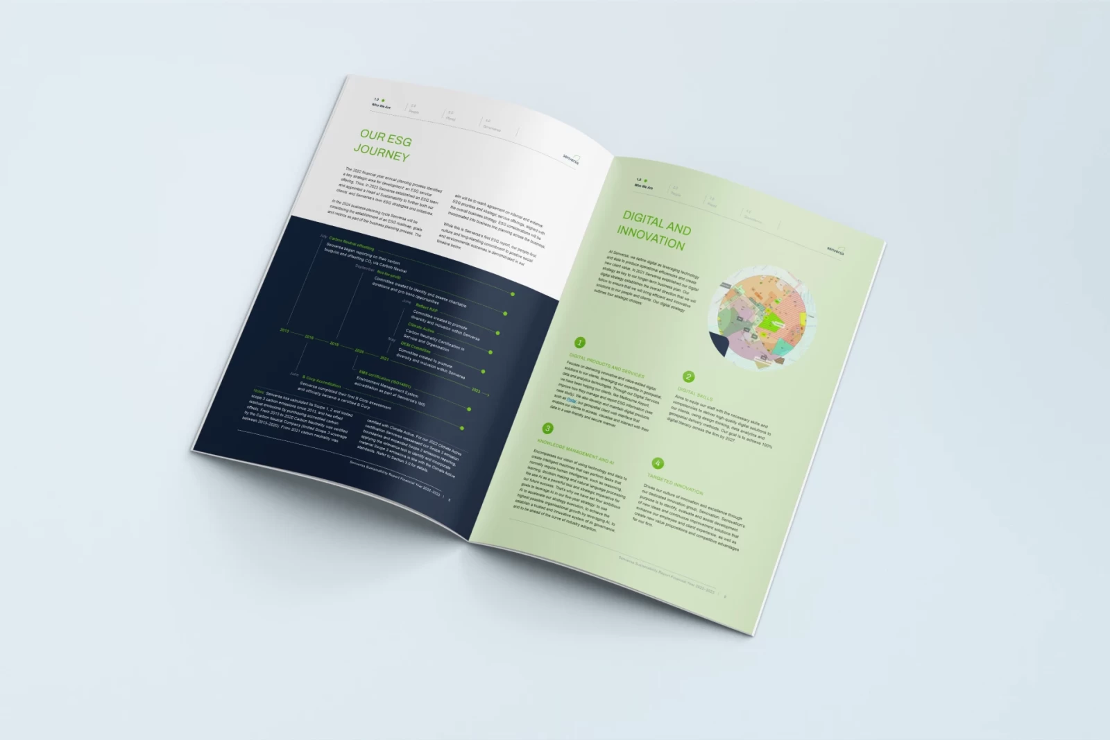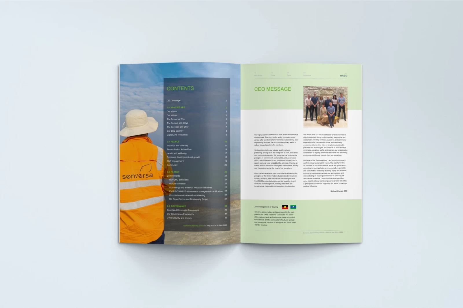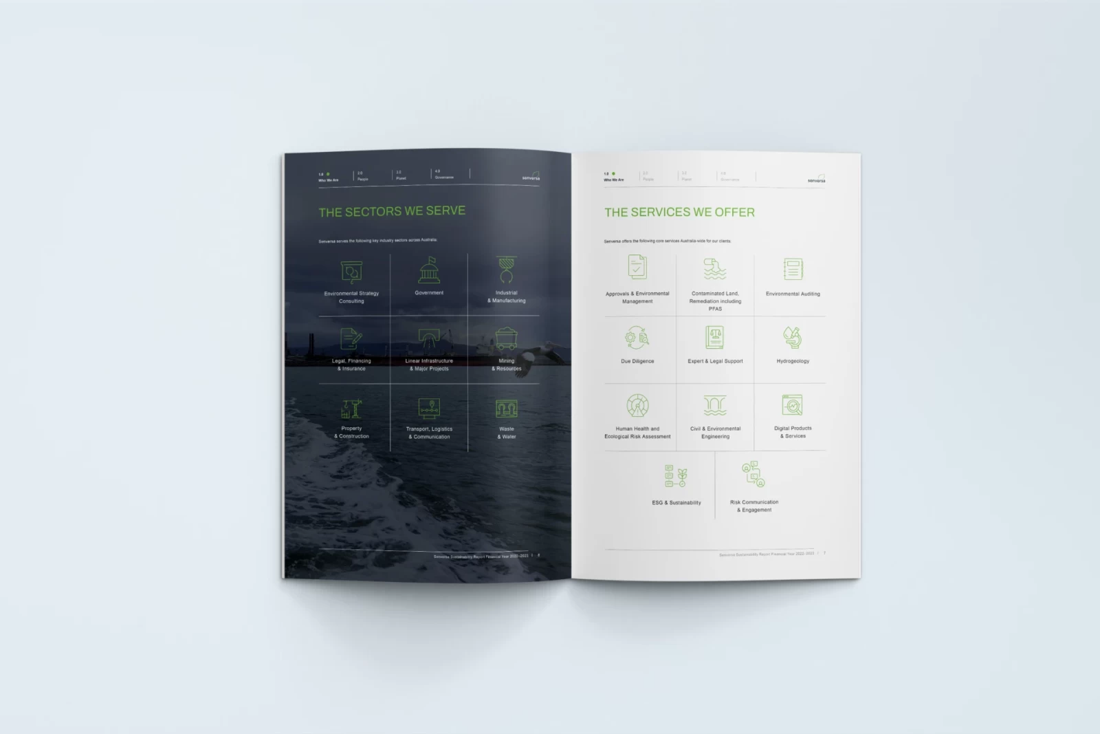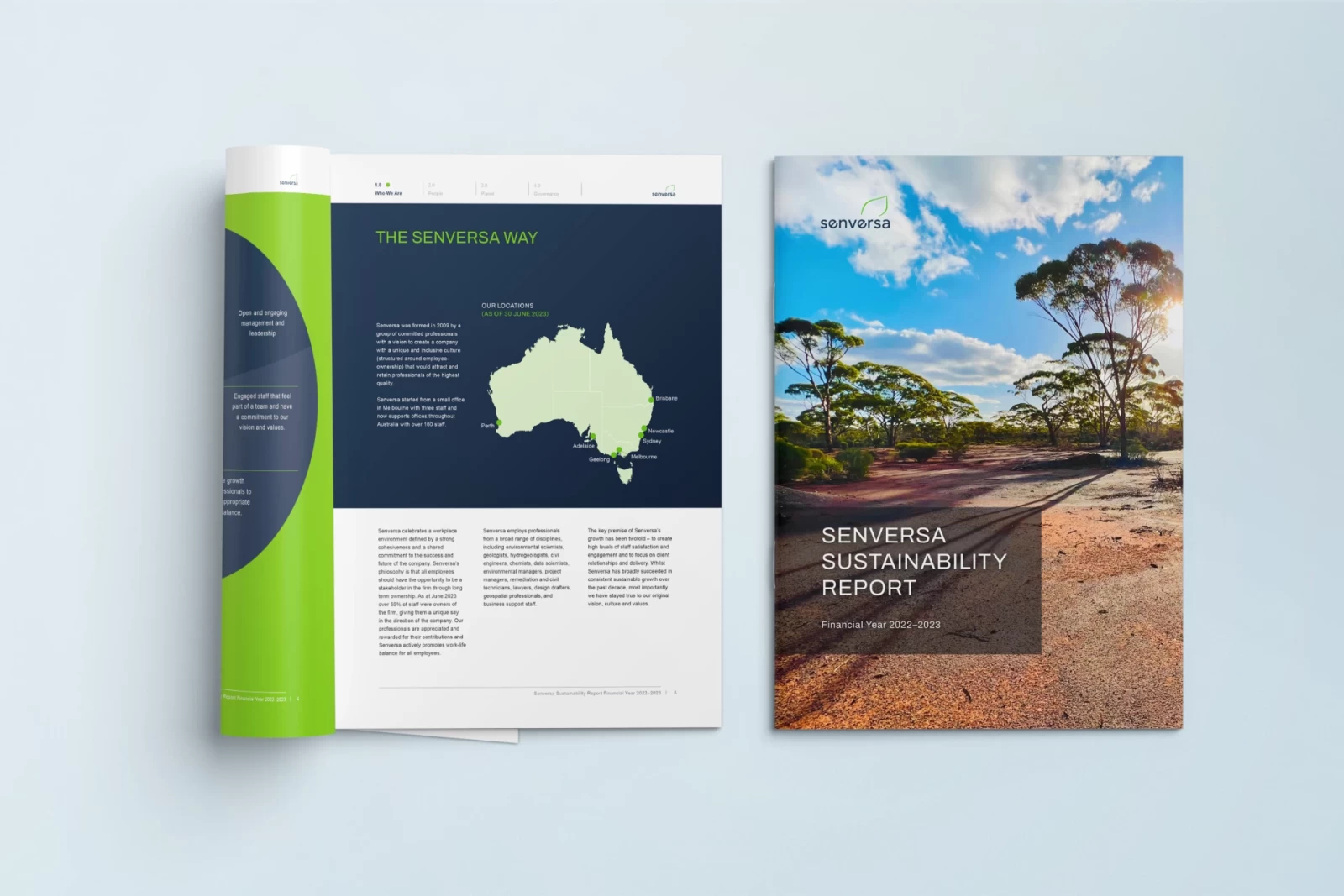 Senversa is an Australian company offering environmental surveying services. I designed the company's 2023 ESG report. When the company approached me they didn't have a fully established template for publications of this sort, so I got an exciting opportunity to define one. I set up a highly flexible modular grid to support the layout, and created efficient navigation within the document that would allow readers to quickly move between sections of the report and the table of contents.